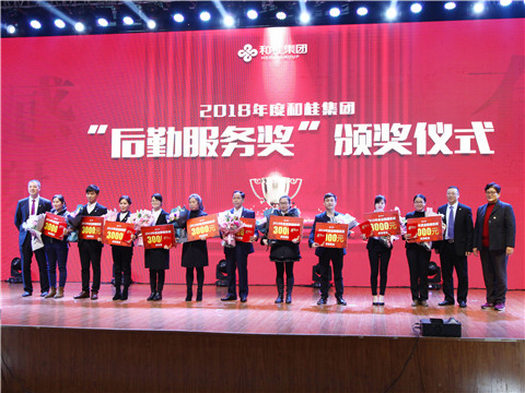 (源生堂工程部季明明(左三)教育部李春燕(左四)榮獲集團“后勤服務獎”)